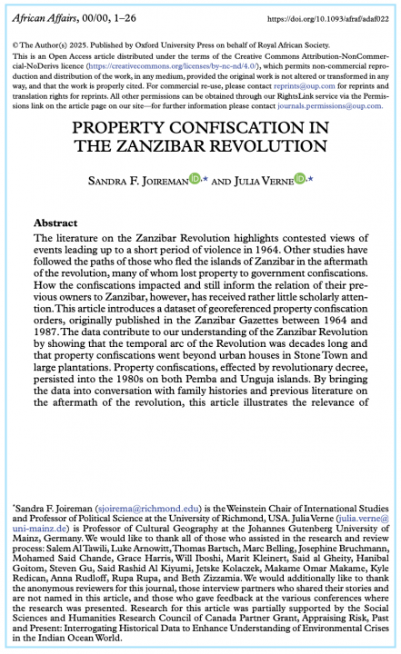 In this article, published in African Affairs, Julia and Sandra (from the University of Richmond, VA) address the loss of property that many experienced in the aftermath of the Zanzibar revolution in 1964 due to government confiscations. Even though a number of scholars have been interested in the events and effects of the revolution, how the confiscations impacted and still inform the relation of their previous owners to Zanzibar has received rather little scholarly attention so far. This article thus introduces a dataset of georeferenced property confiscation orders, originally published in the Zanzibar Gazettes between 1964 and 1987. The data show that the temporal arc of the Revolution was decades long and that property confiscations went beyond urban houses in Stone Town and large plantations. By bringing the data into conversation with family histories and previous literature on the aftermath of the revolution, this article illustrates the relevance of Revolutionary era property losses for questions of identity, belonging, desire for restitution, and ongoing development efforts.
